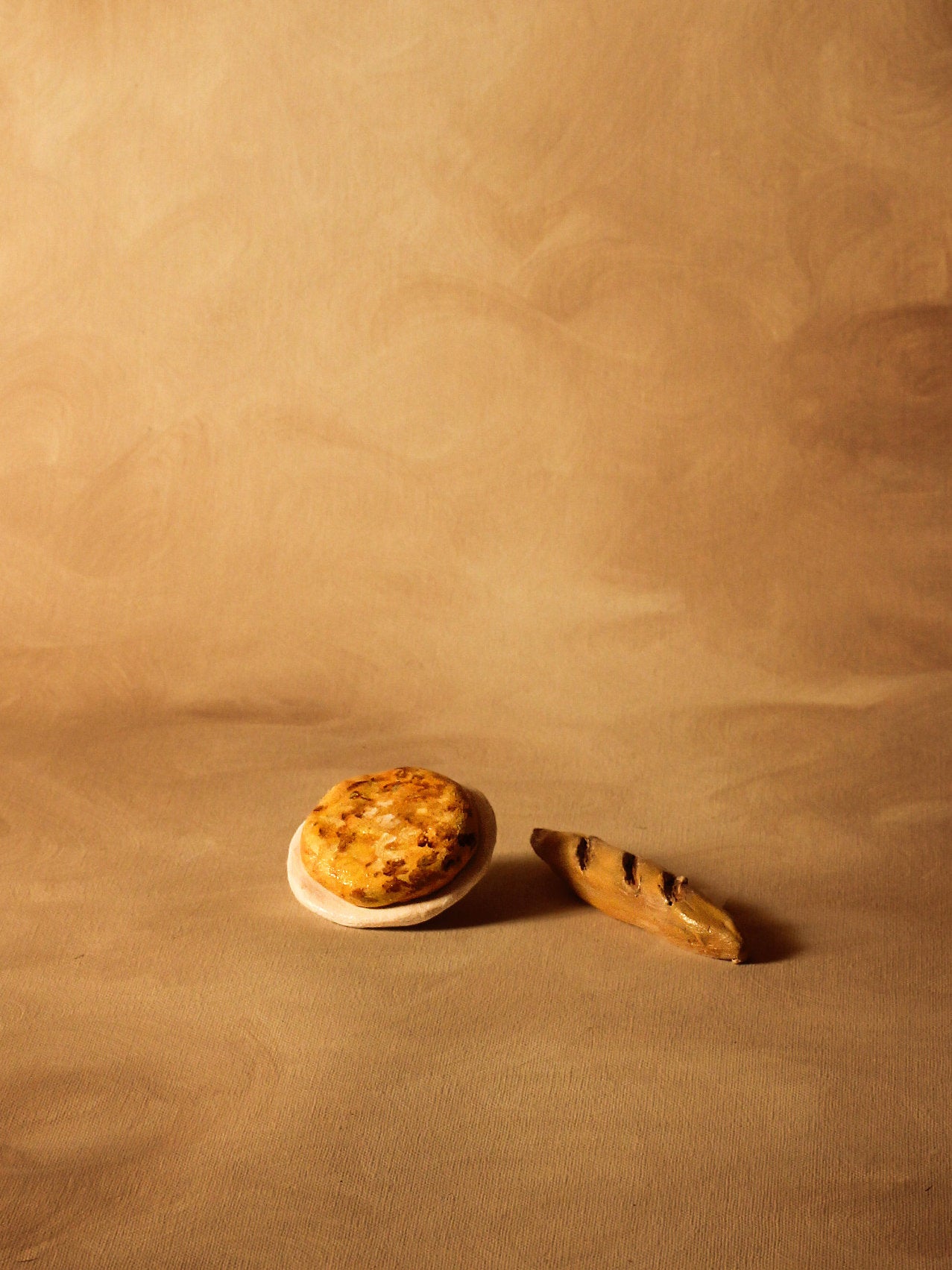 Tortilla de patatas de cerámica con su plato y una barra de pan. Debido a su elaboración manual cada pieza tiene particularidades únicas.